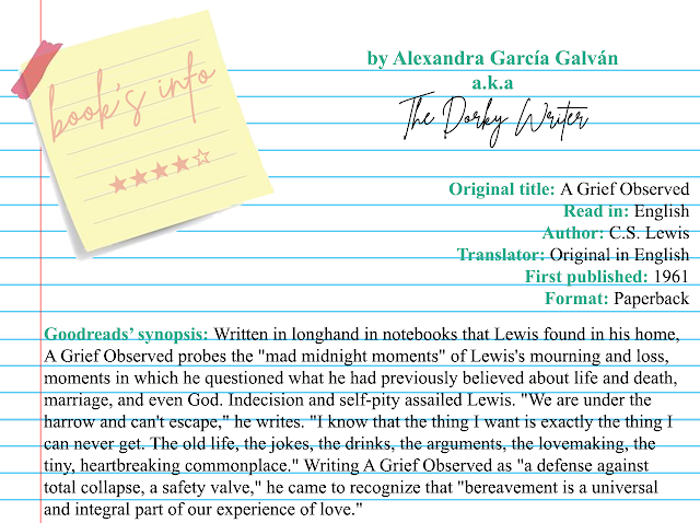 I am not a religious person, I tried to but failed years ago; I've always disliked when people approach me and try to make me feel better by saying that God works in mysterious ways and stuff like that. Lewis's words felt different. In his despair, he questions God's intentions, but in the end, you can see evolution and acceptance, because no matter how much you blame a deity or try to find your questions answered, this deity can't bring you that person back, so if your relationship was a pure one, you can always go back to those beautiful memories.